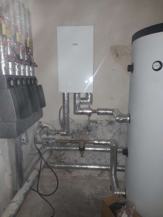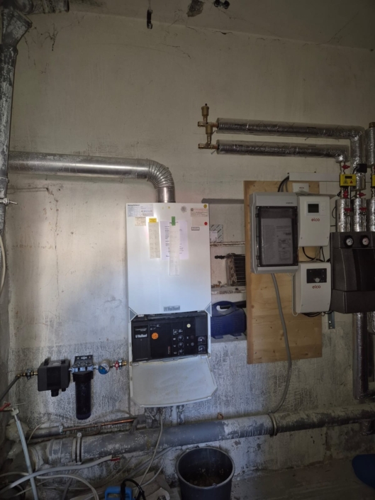 Im Nebengebäude hing eine alte Gastherme, die das Haus beheizte und Warmwasser bereitete. Modernisiert wurde das Haus mit einer Elco-Wärmepumpe 10 kW und einem 600 Liter Pufferspeicher für drei Wohnungen.